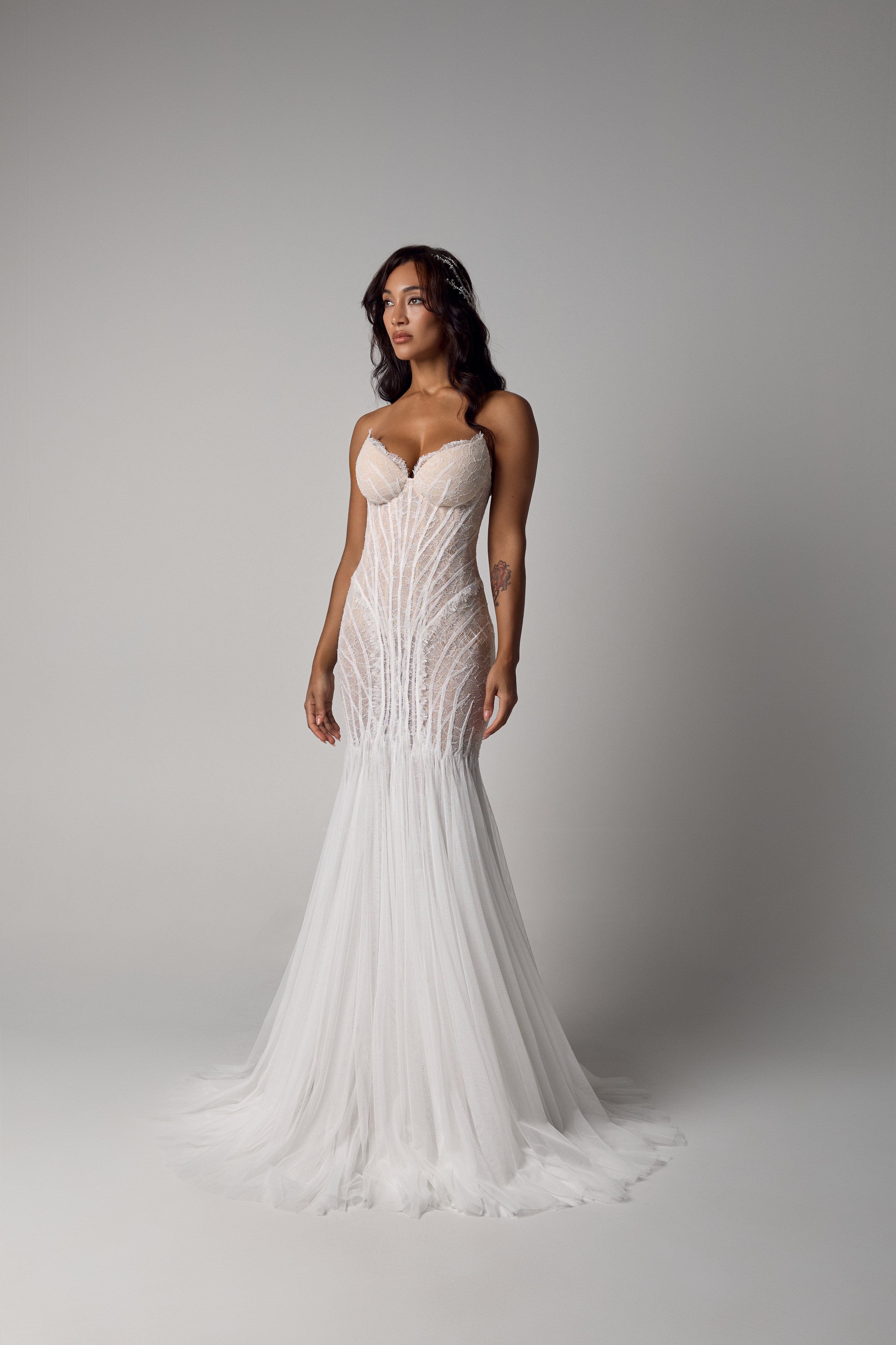 The strapless bodice flows seamlessly into a fitted mermaid shape that hugs the body through the hips, before flaring into a soft tulle skirt from the knee. This elegant transition adds lightness and movement, combining structure with graceful flow.